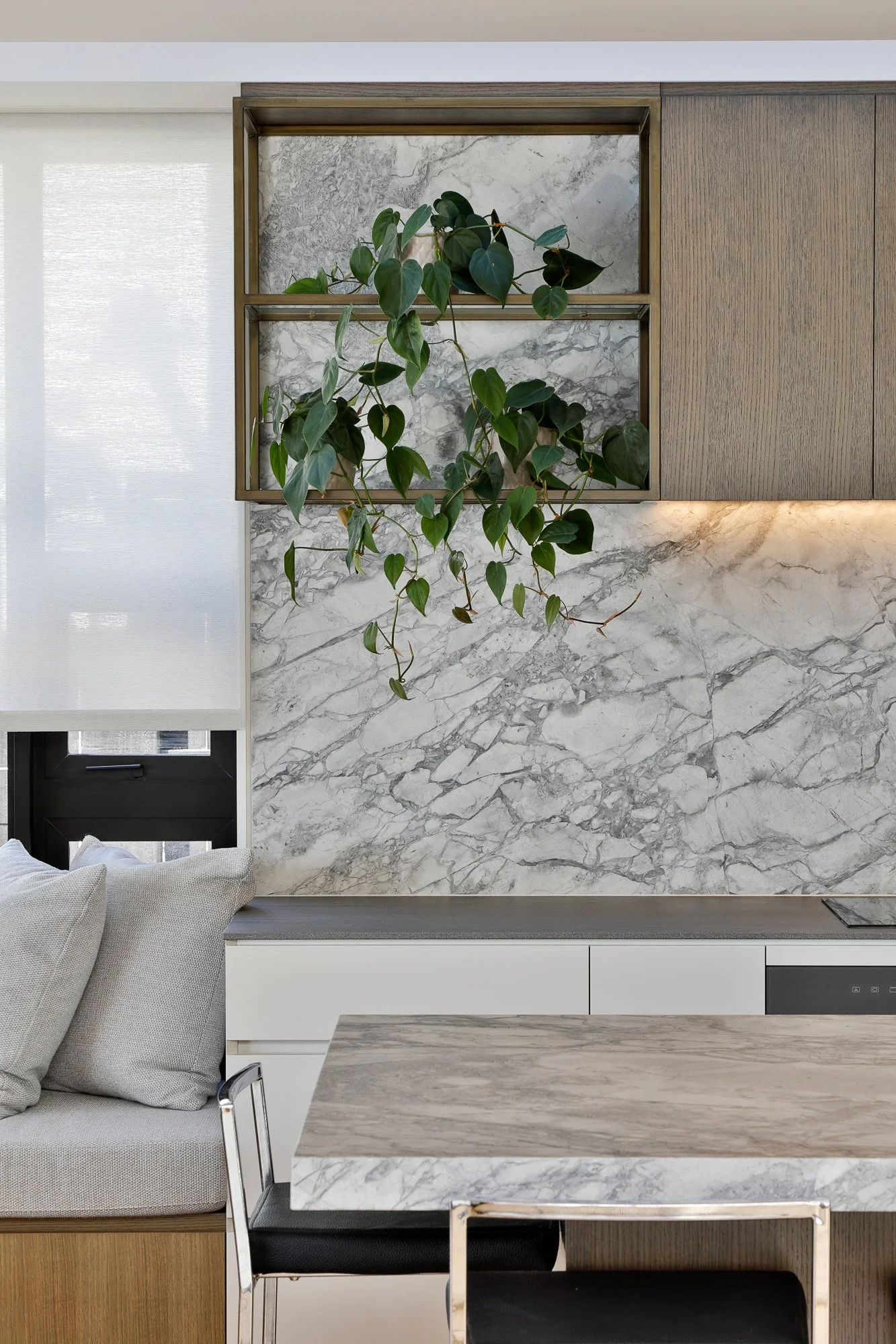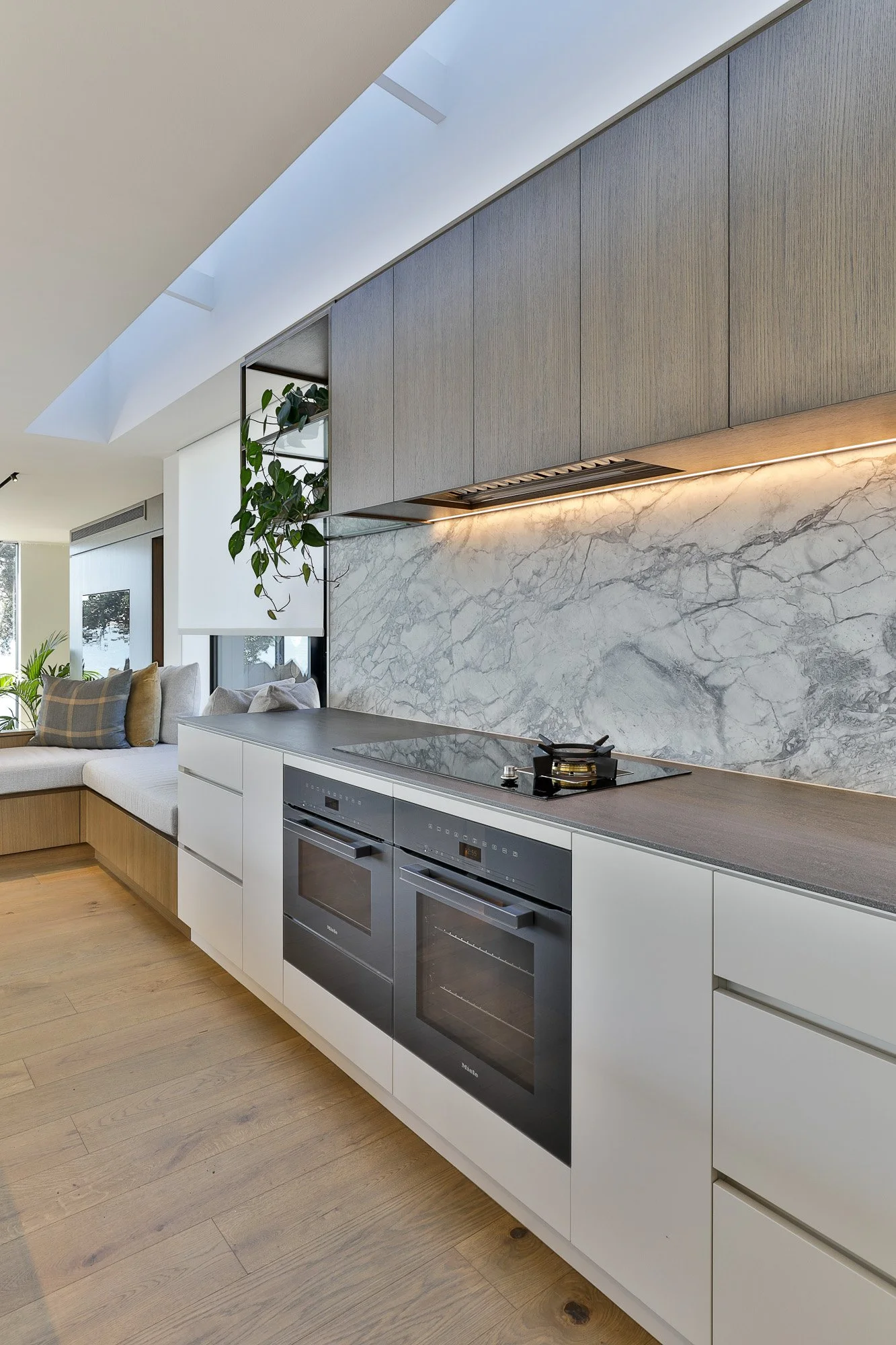 Calm and uncluttered, full of warm muted tones with accents of natural stones and timber grains, this kitchen is the central hub of this stunning beach front home. Designed to be both functional and beautiful with care not to distract from the stunning ocean view. The client asked for a comfortable seating area close to the kitchen, where friends and family could relax and chat while meals were being prepared.
