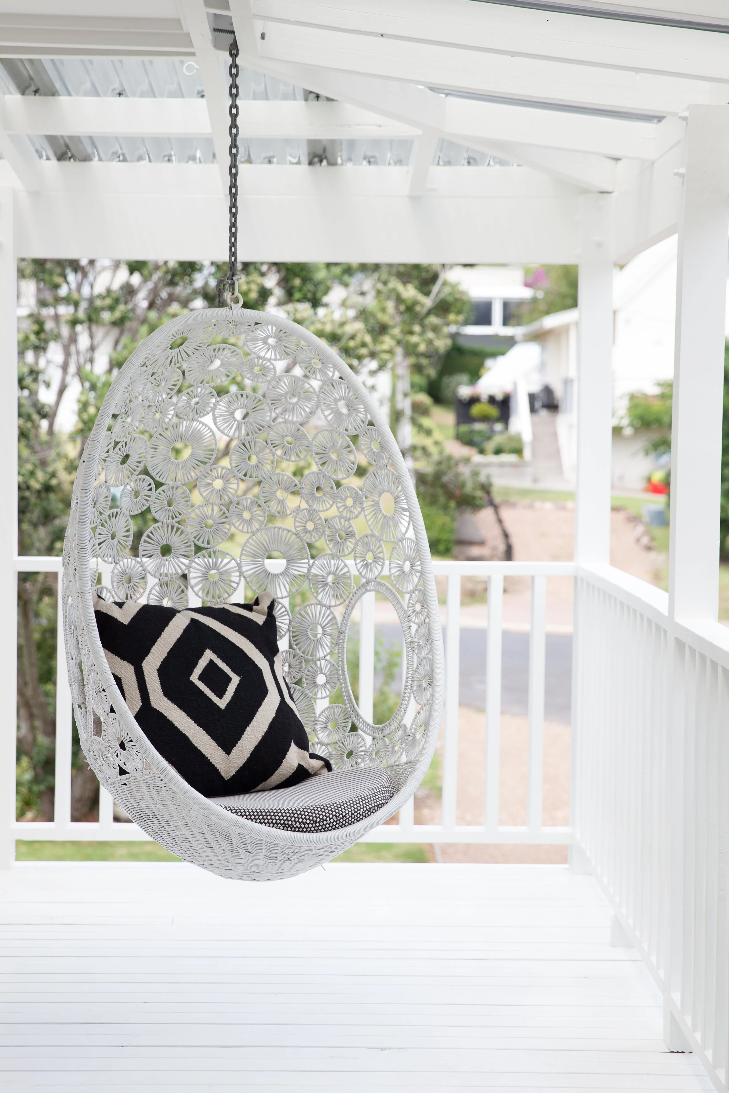 The living area sports a beautiful wood-look tiled floor from the Tile Warehouse which is indestructible – perfect for a busy couple and their active dog Riley, and the use of hexagonal wall tiles in the showers of both bathrooms with the herringbone white tile in the kitchen, add texture and interest to the calm, simple spaces. The gorgeous white shutters and white painted original flooring in the bedroom seamlessley flow out to the spacious verandah, with hanging egg chair.
