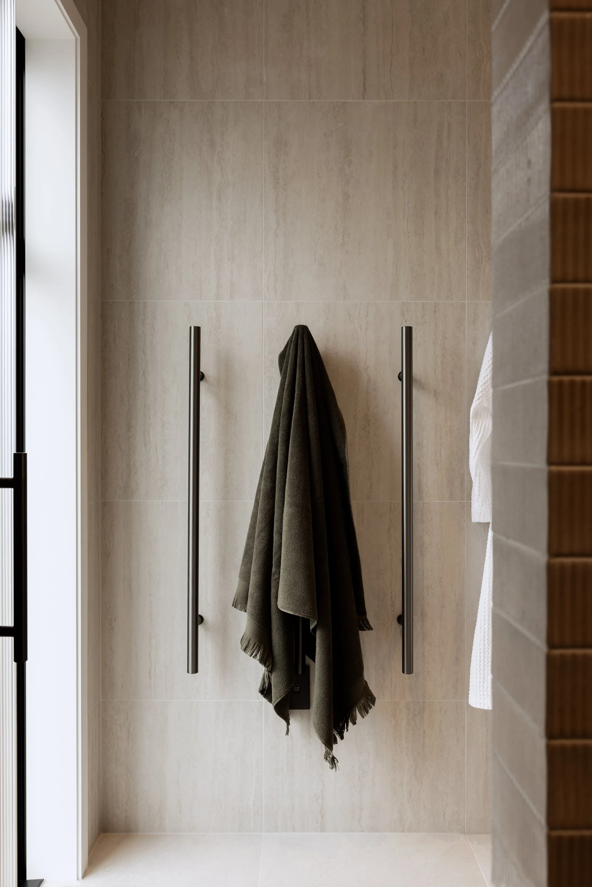 The material palette leans into rich, textural contrasts with burnished concrete flooring, deep timber grains, and matte black accents, creating a sense of weight and permanence. Designers Sophia Cole and Kate Bradley, working from the Hamilton studio, developed a carefully balanced scheme that introduces moments of drama through the living spaces and powder room, while maintaining warmth and comfort within the bedrooms and bathrooms. Considered detailing, from bespoke cabinetry to refined lighting, adds depth and sophistication without detracting from the architectural clarity.
