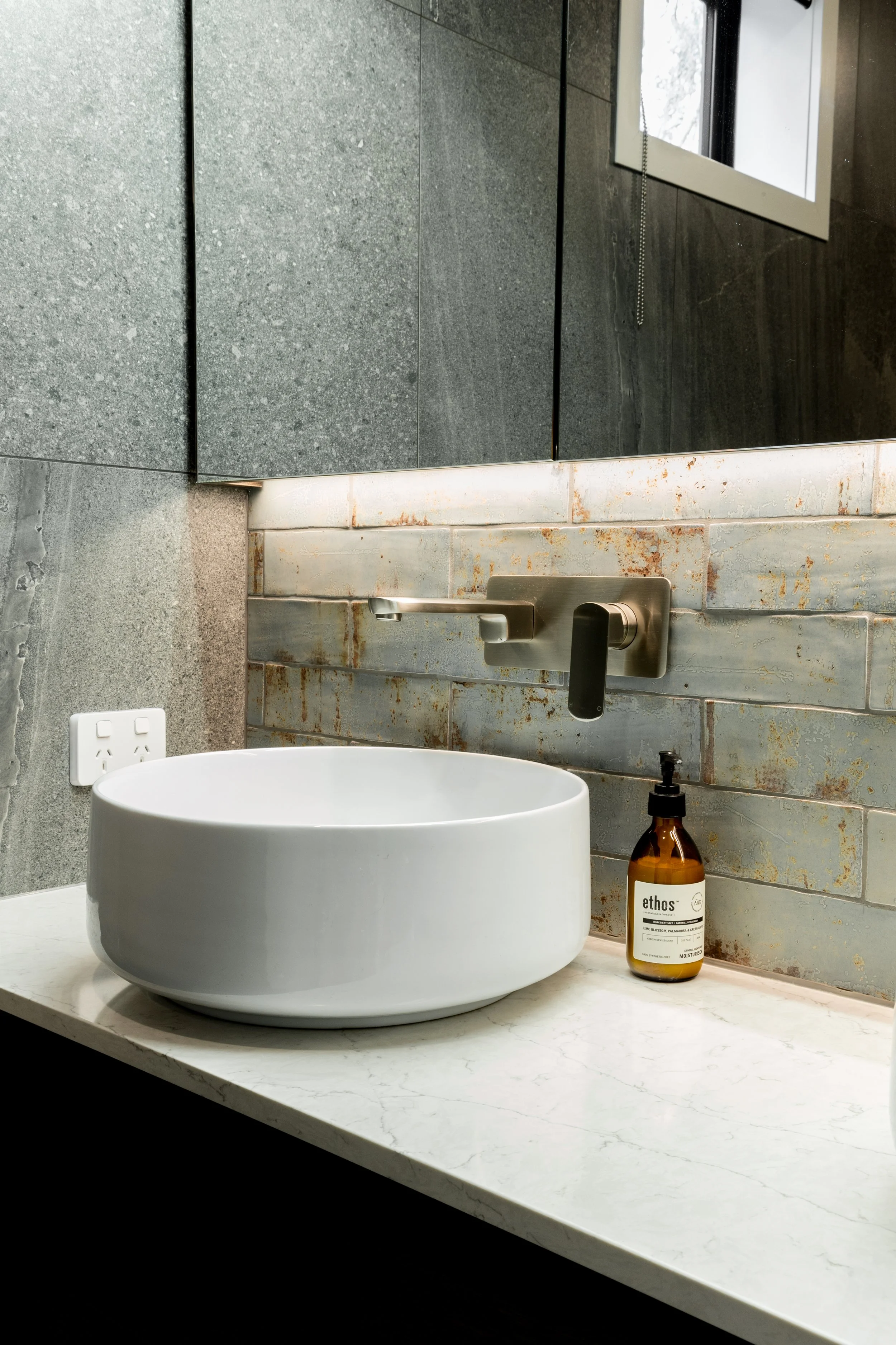 An industrial entranceway and staircase sits opposite a jaw dropping view of Palm beach and the surrounding hillside. Lighting plays a major part in this moody space with feature pendants from ECC in both the kitchen and stairwell. The kitchen cabinets in Prime Black Soft Matt and Designatek Milan Ecru White sit quietly against the textured Grunge Iron tile from Tile Warehouse, while the bar area with its’ Antique Bronze Glass splash by Image Glass is lit with colour changing LED lights sets the scene when it’s time to party. Each bathroom is personalised with beautiful mosaic tiles and storage is maximised with inset wall to wall mirror cabinets.
