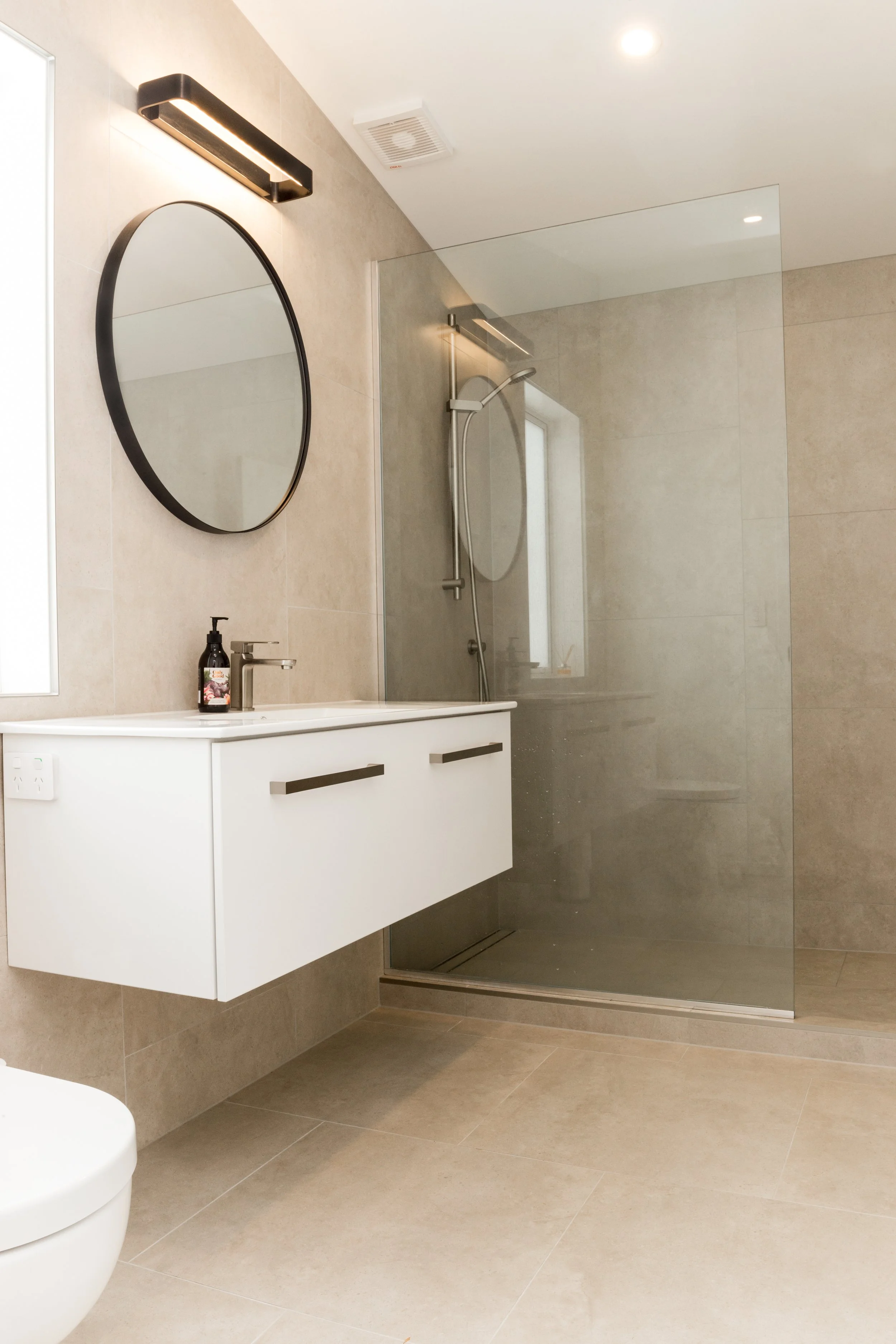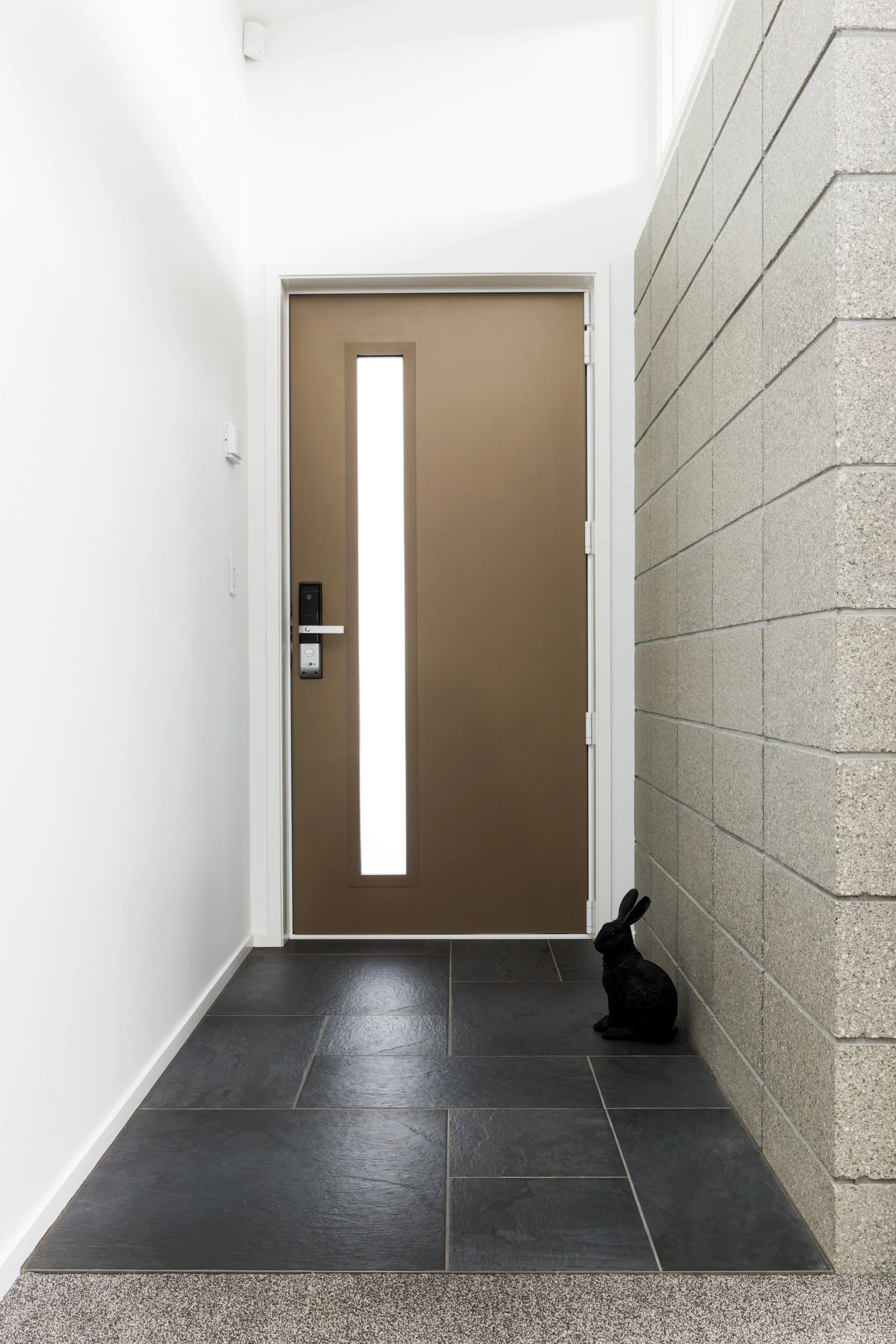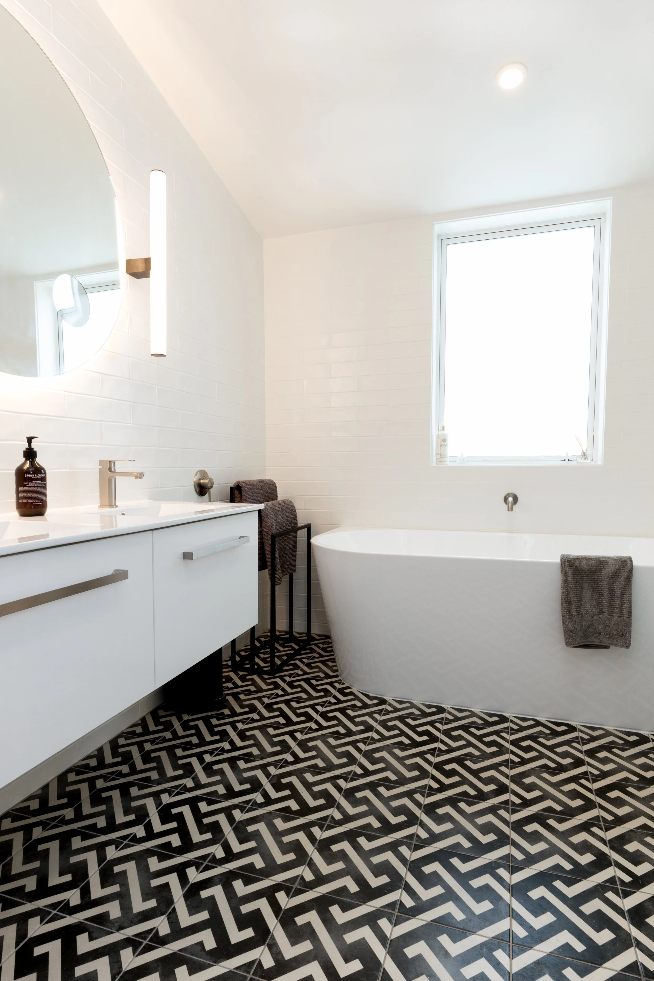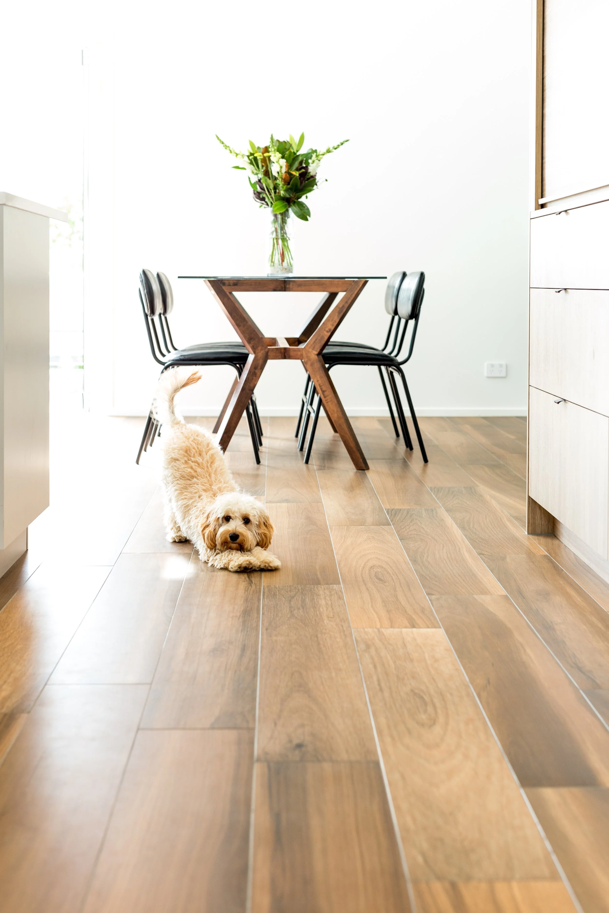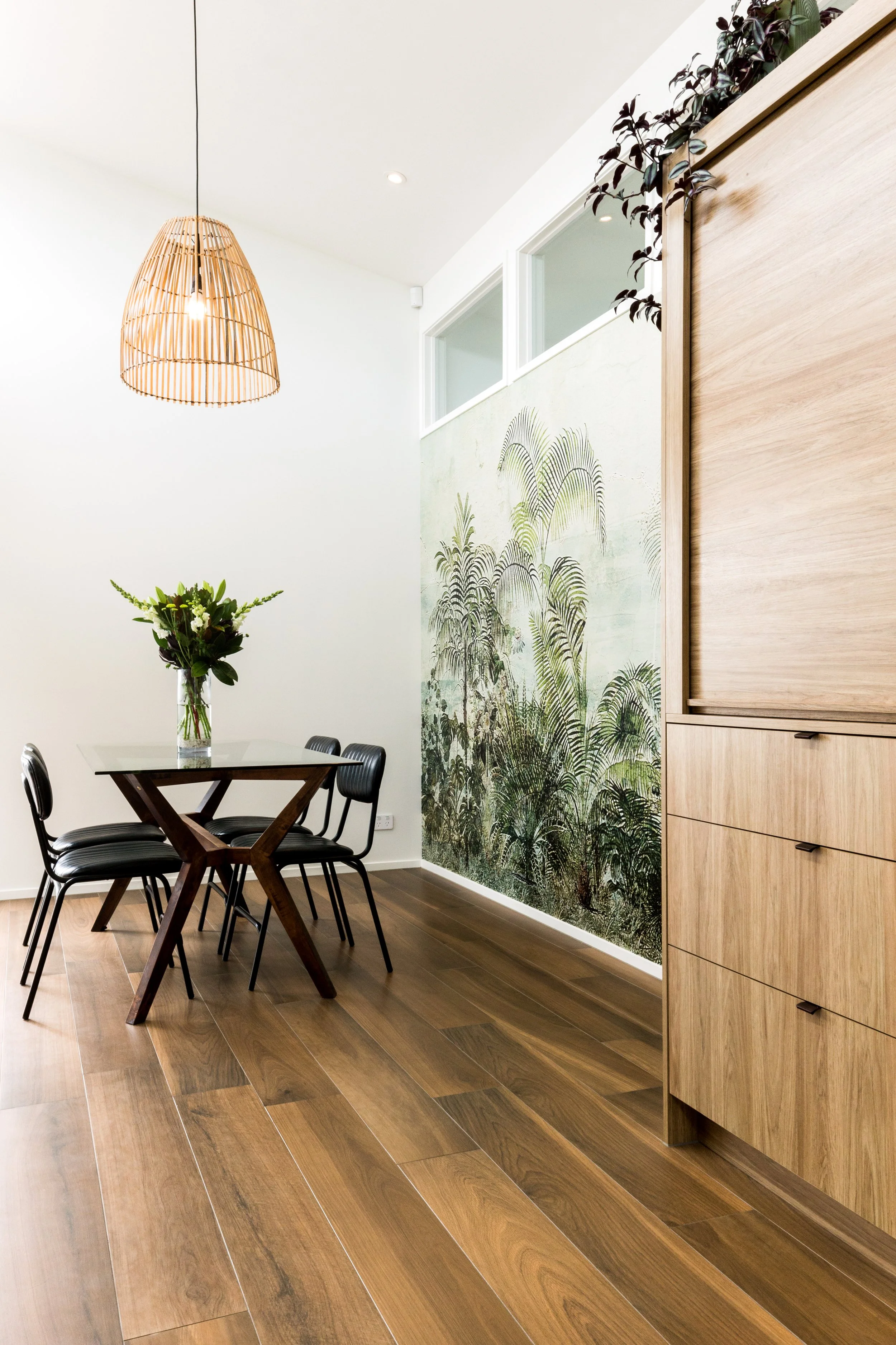 Modern mid-century…the architectural form gave the inspiration to this new build in Westmere by Landmark Homes. A warm white neutral backdrop with sculptural beams soaring to partitioned glazing lending light to the hallway, the large open-plan space is punctuated by a large kitchen with plenty of bench space for the client’s love of baking. Fully entrusting designer Andrea Burney, the client had an open brief on a tight budget to which practical materials with warmth, pattern & texture were applied. Timber grain units reminiscent of retro furniture ground the Bestwood and Prime by NZ Panels kitchen, with handles by Archant and tiles throughout by Tile Warehouse. Brought to life with greenery, both in living form and in the customised mural wallpaper, the stunning result offers a calming backdrop to a busy family. A custom-designed entrance tiling pattern by the designer added to the personalised mid-century feel of the home. The practical & stunning timber tiled floor throughout the living spaces has fooled many into thinking it is real timber and has made many a pet-owning visitor jealous!